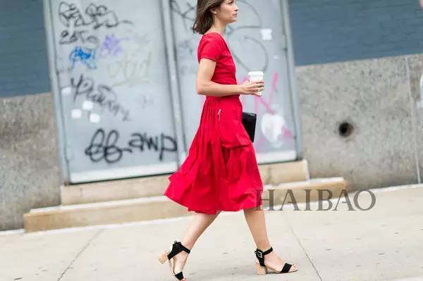 鞋子的定调作用。鞋子决定风格的最终走向。想要优雅女人味,就选裸色或黑色的高跟鞋,裸色能神奇地延伸腿长-6。想要复古俏皮感,玛丽珍鞋、乐福鞋是绝配-1。想要休闲舒适,小白鞋、黑色短靴也能搭出不一样的时髦感。甚至,你可以大胆地尝试红色鞋子,与裙子形成同色系不同材质的碰撞,非常有整体感-6。