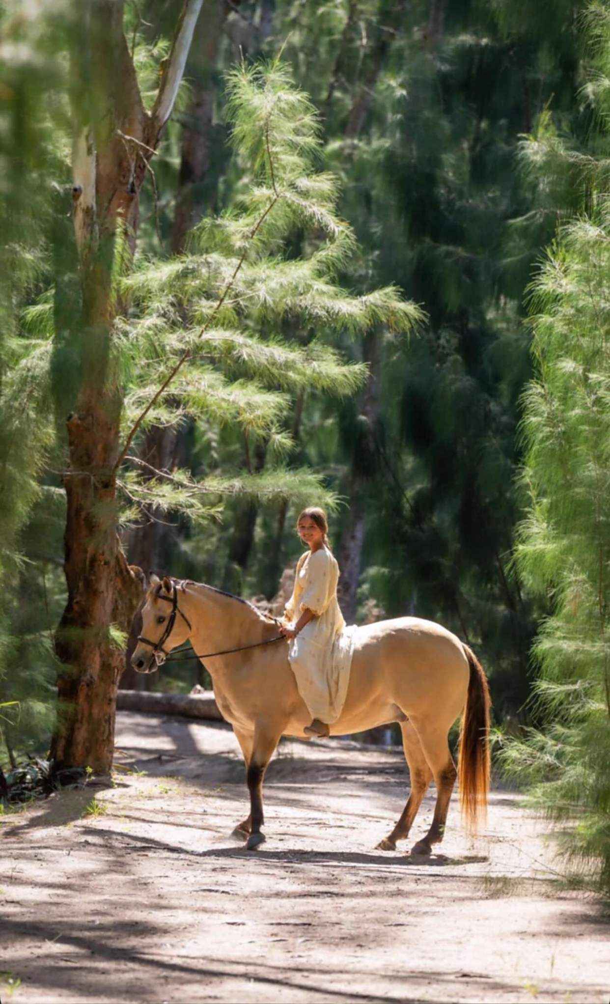 骑白马穿梭森林的阿拉贝拉,美得像森林精灵,仙气十足。逆光中的她比电影海报还好看,一人一马氛围感拉满。