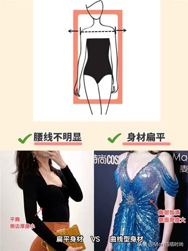 扁平身材通常胸部较平,侧面看起来比较薄。而曲线型身材胸部饱满,侧面厚度大。搞清楚这些特征,就能轻松判断自己是不是扁平身材啦~