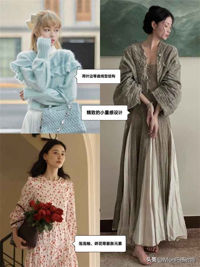 荷叶边、蝴蝶结这些曲线设计,泡泡袖、碎花、垫肩等膨胀元素,刺绣、雪纺这些小亮点,都能增加身形饱满度,一定要多穿!