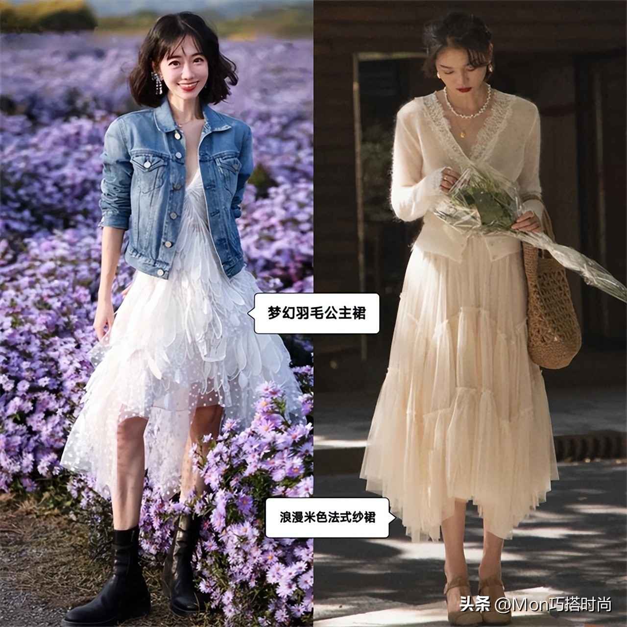 梦幻的羽毛公主裙混搭牛仔马甲和马丁靴,甜酷风轻松拿捏。穿一件浪漫的米色法式纱裙,简直就是“翩若惊鸿”的真人版~