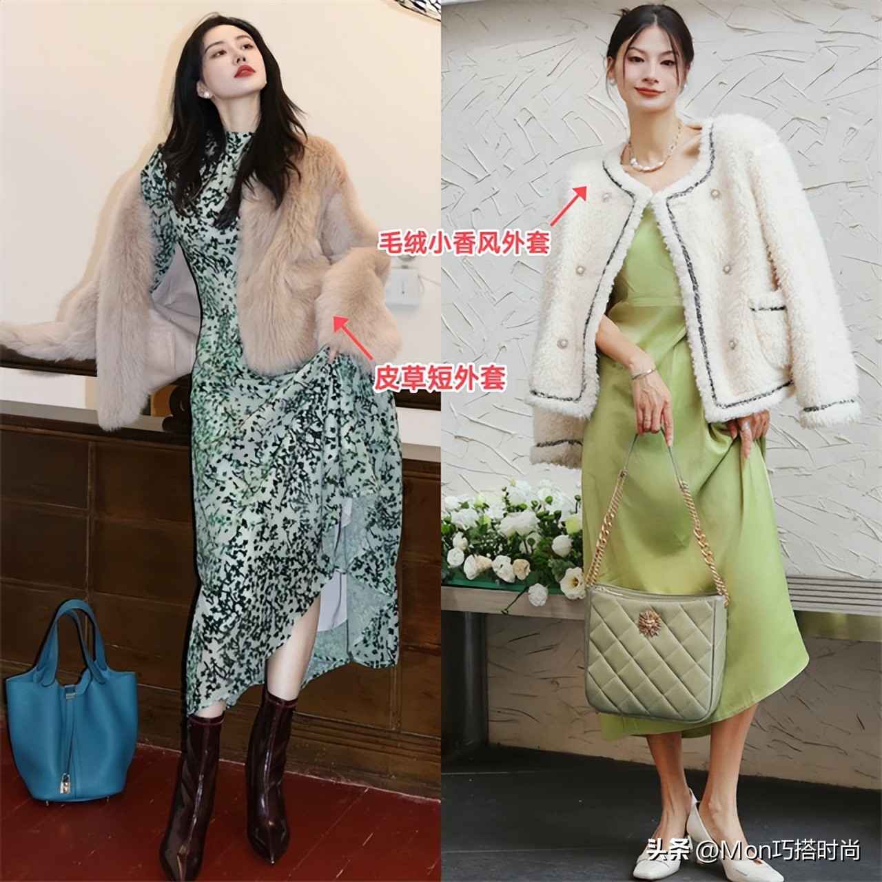 皮草短外套选浅色配碎花裙,小香风外套用软毛绒代替粗花呢,这才是为扁平身材定制的满分搭配~