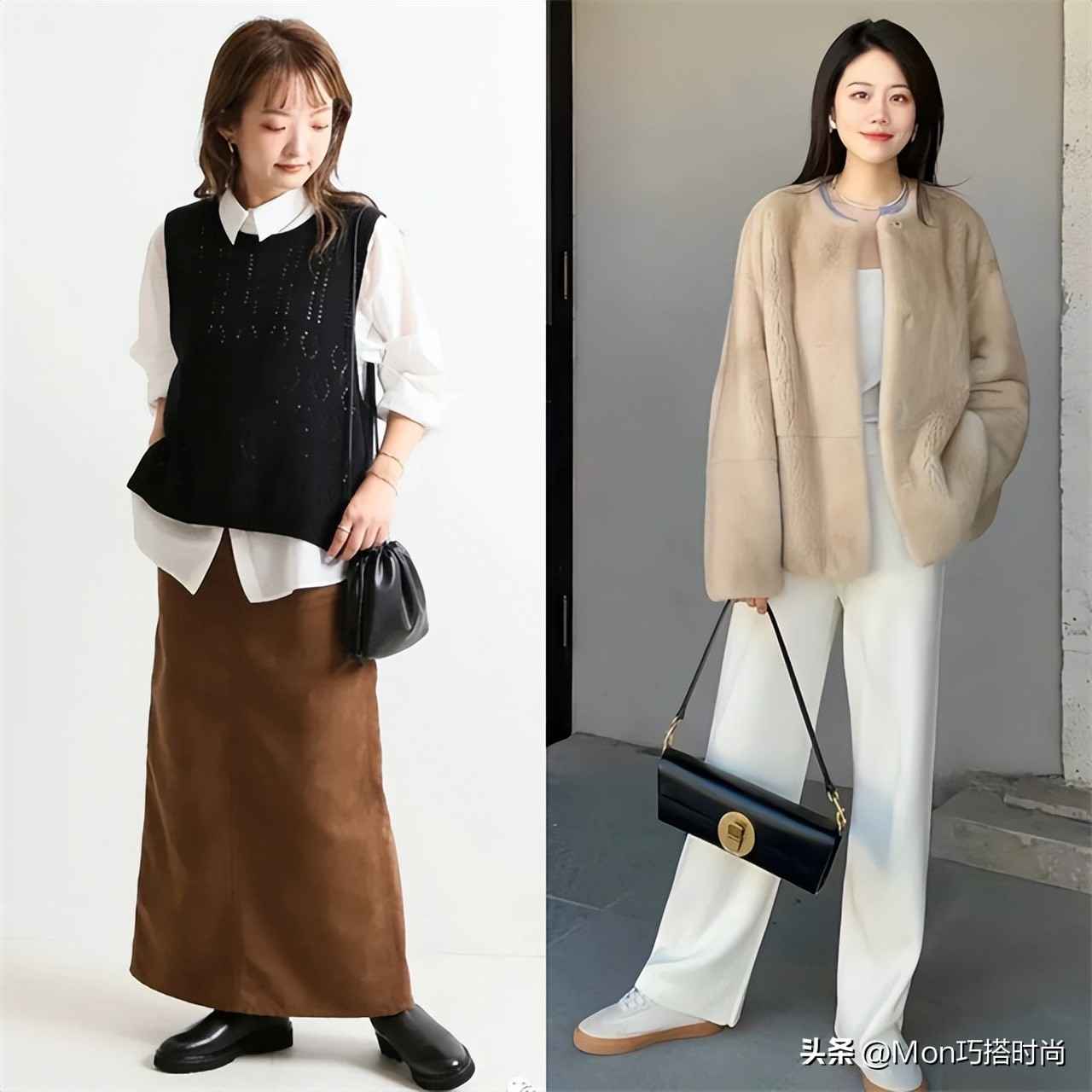细针织的更简约高级,水貂绒的更温柔,选浅色系最出彩。用同色系或相近色搭配不同材质的上衣,效果绝了!