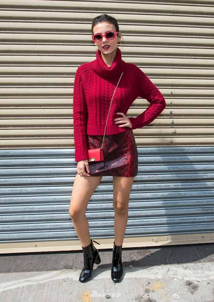 想要又甜又酷?试试皮裙。 软软糯糯的红毛衣,和皮质短裙的硬朗光泽搭在一起,这种材质上的碰撞简直绝了-3。一下子就把红毛衣可能有的那点点“甜腻”给中和掉了,变成一种甜酷风。怕冷的话,里面穿上加绒的光腿神器,配上长靴,保暖和风度兼得-3。