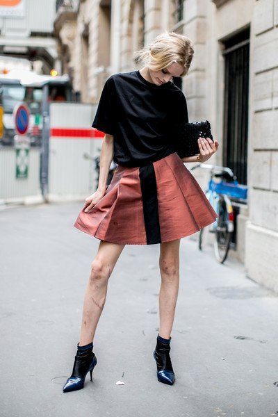 黑色半裙之所以能成为四季常青的单品,离不开丰富的面料选择。这其实也悄悄影响着上衣的搭配。