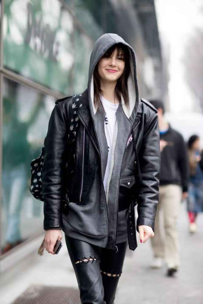 如果你追求更强烈的个性风格,那必须试试用卫衣搭配飞行员夹克或皮衣。飞行员夹克的短款设计和束口下摆,能很好地优化比例,内搭一件纯色卫衣,再配上工装裤和老爹鞋,街头潮人感拉满-9。而皮衣的酷劲遇上卫衣的慵懒,会产生奇妙的化学反应,让你帅气中又不失亲和力-3-8。