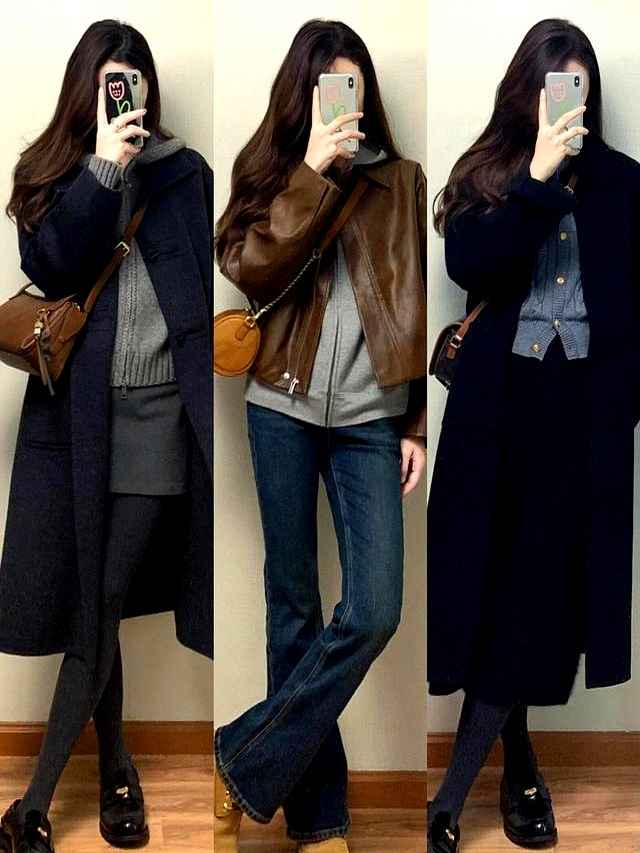 5℃寒冷天:陶土棕短夹克+深灰针织+同色灯芯绒裤,夹克长度盖臀,适合臀大姐妹,灯芯绒选竖纹,远看像拉长线条。