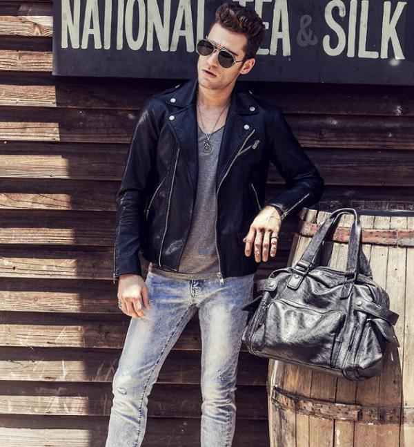 如果觉得西装太正式,日常出行可以试试PU皮衣外套。它不仅时尚有型,还能突出男性魅力。搭配一件T恤和破洞牛仔裤,简约又不失男人味,还能巧妙遮龄,适合休闲场合。
