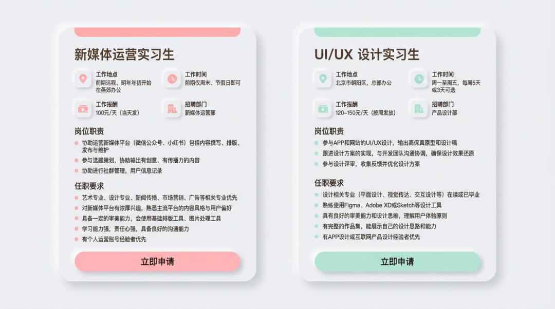 我最近想招新媒体运营助理,找了学校老师帮忙发招聘,但纯文字版不易读,这里直接生成两张招聘卡片。