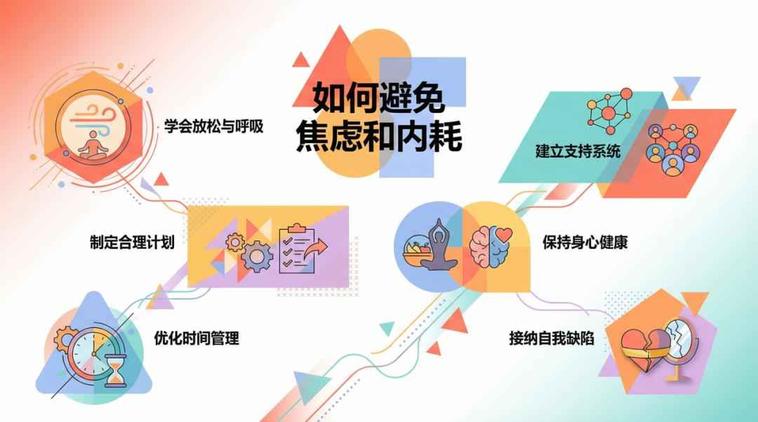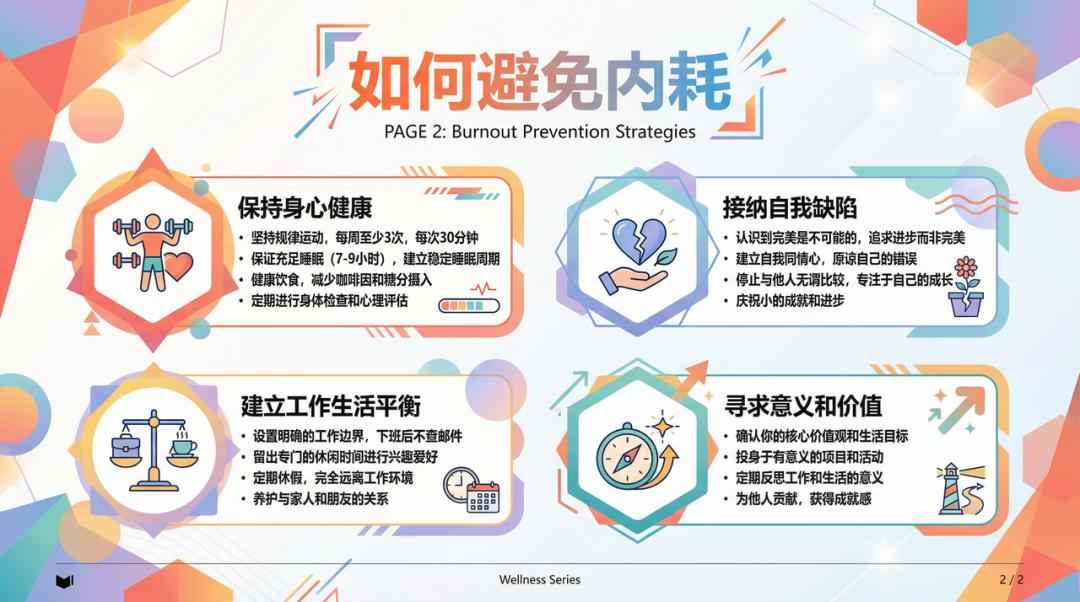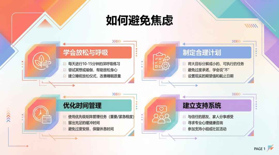 随后我要求把焦虑和内耗分成两页PPT,并加些文字。下面是结果。
