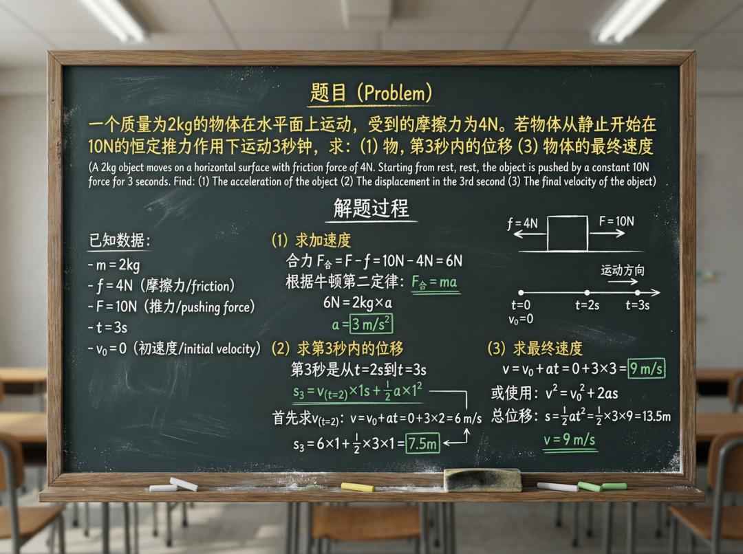 这个任务很有趣,我指定了一道初中物理习题,要求把解题过程写在黑板上。模型不仅生成图片,还涉及推理过程。