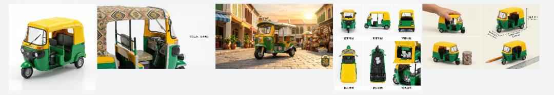结果不仅生成了多角度图,还加了尺寸标注。标注用了数字和参照物,更直观。这个任务生成了多张图,下面放个集合图展示。