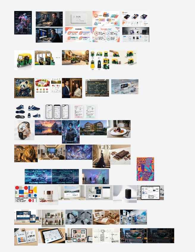 生成多图时,Lovart的无边画布体验很好,支持多任务同时显示和素材堆叠,长图创作也方便。结尾会放所有测试任务的大合照展示无边画布。
