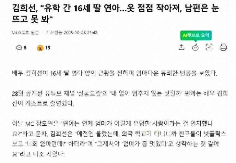 金喜善在综艺节目里聊起女儿的着装风格,直接点出问题——16岁女儿参加派对时,裙子越来越短、上衣越来越小,老公看完照片当场说“眼睛不知道往哪放”,一句话戳中无数家长的软肋