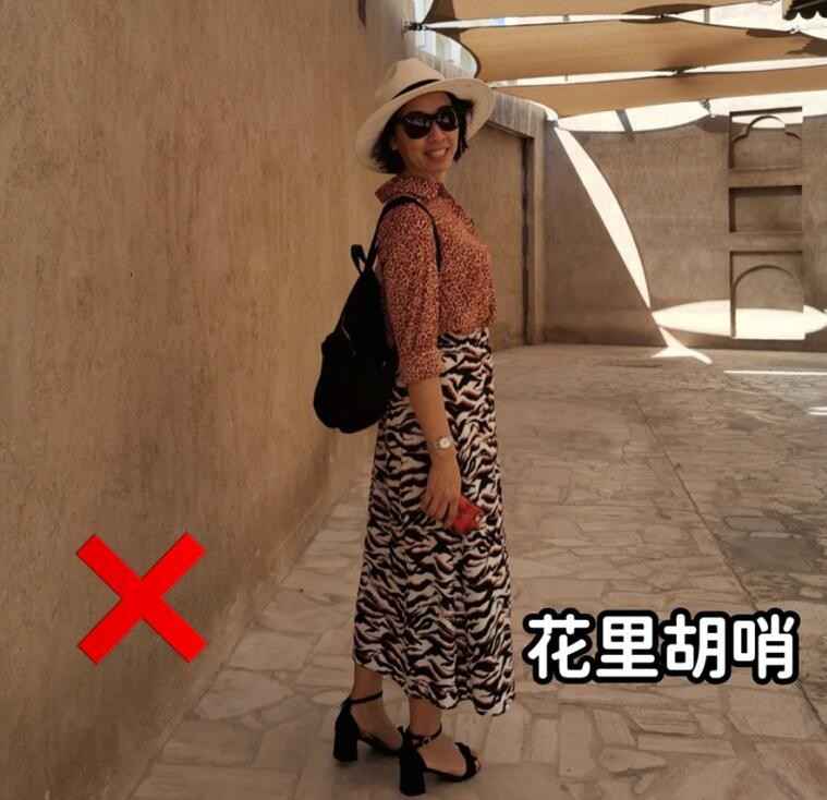 还有些花色复杂的衣服,50岁女性容易心动,觉得能显年轻。但用力过猛的话,全身都是密密麻麻的图案,就像上图这样,豹纹衬衫配斑马纹裙子,看得人眼花缭乱,反而没气质。