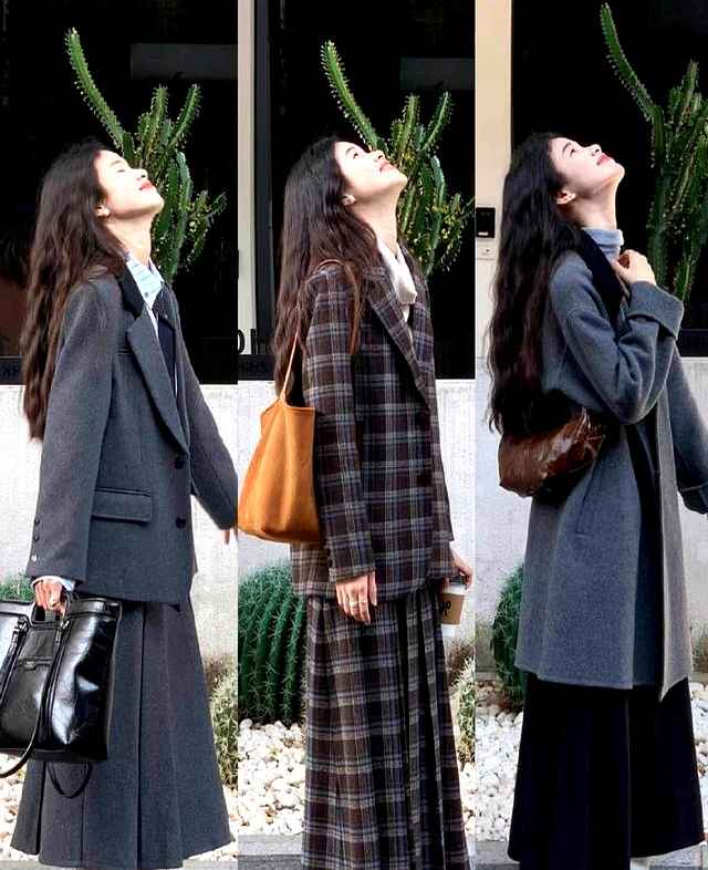 上班赶时间,可以套用“三件式”公式:格纹短外套+纯色飘带衬衫+皮质半裙,十分钟就能搞定出门造型。