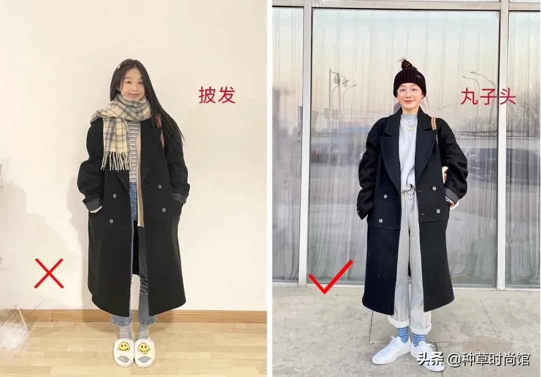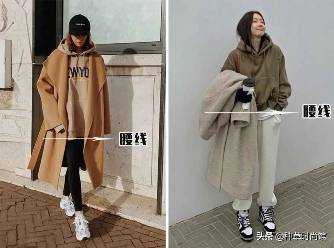 搭配大衣时,内搭选短款能拉高腰线,太长会显得上半身笨重,容易显矮。