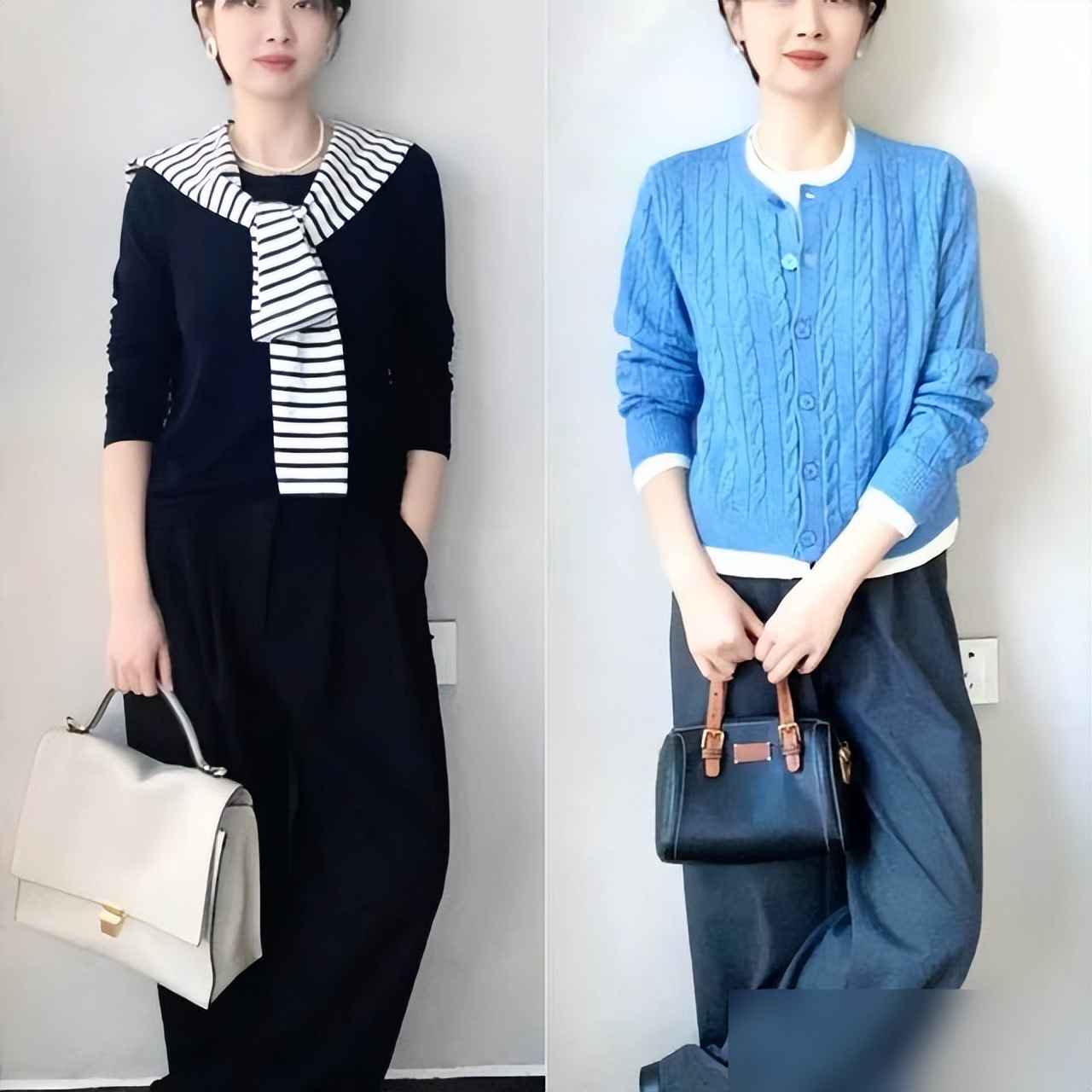 比如黑灰配加米色包,或者浅灰针织配中灰裤?